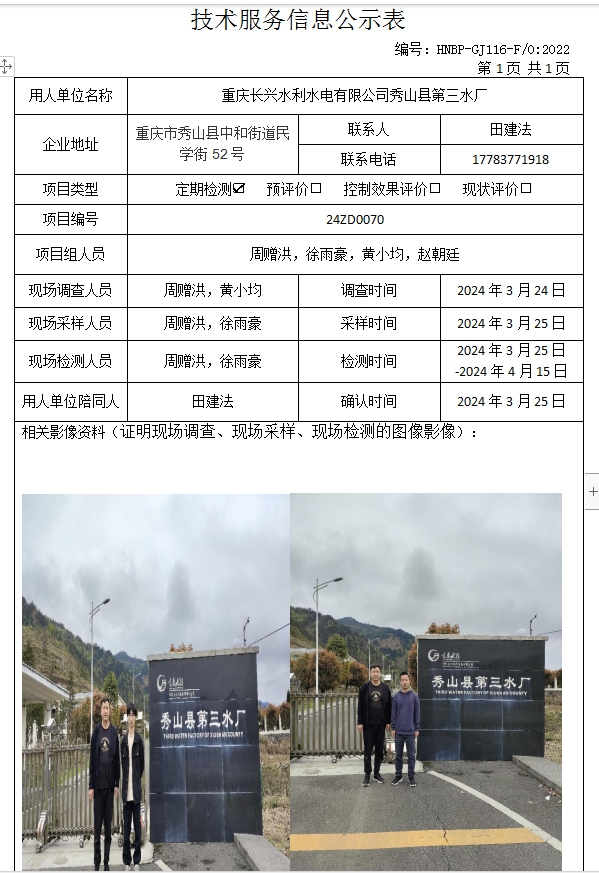 重慶長興水利水電有限公司秀山縣第三水廠定期檢測項目公示