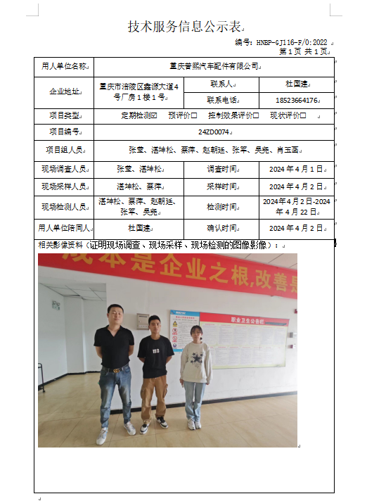 重慶普熙汽車配件有限公司定期檢測項目公示