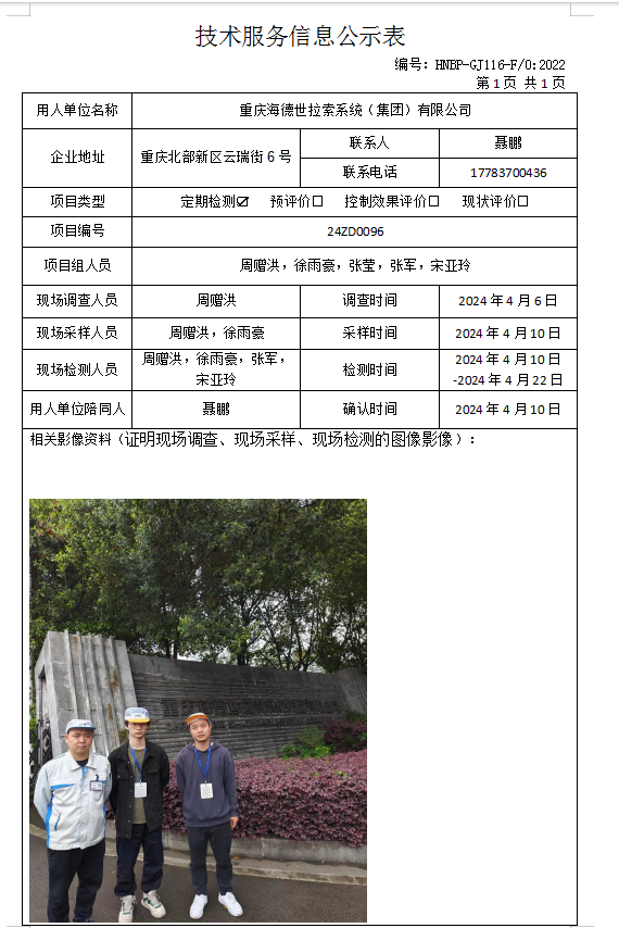 重慶海德世拉索系統(tǒng)(集團)有限公司定期檢測項目公示