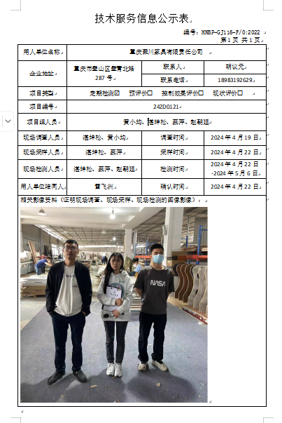 重慶聚川家具有限責任公司定期檢測項目公示