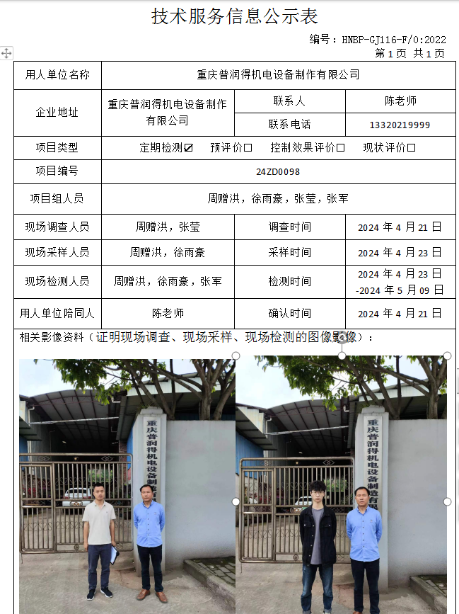 重慶普潤得機(jī)電設(shè)備制作有限公司定期檢測項目公示