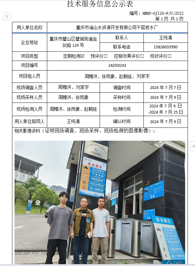 重慶市渝山水資源開發(fā)有限公司千層巖水廠定期檢測項(xiàng)目公示