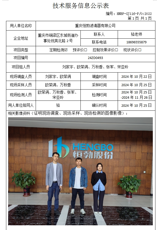 重慶恒勃濾清器有限公司定期檢測項目公示