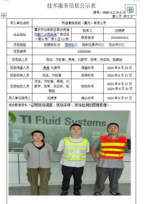 邦迪管路系統(tǒng)(重慶)有限公司定期檢測項(xiàng)目公示