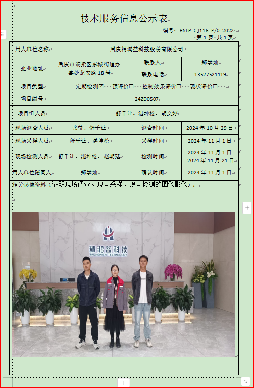 重慶精鴻益科技股份有限公司定期檢測項目公示
