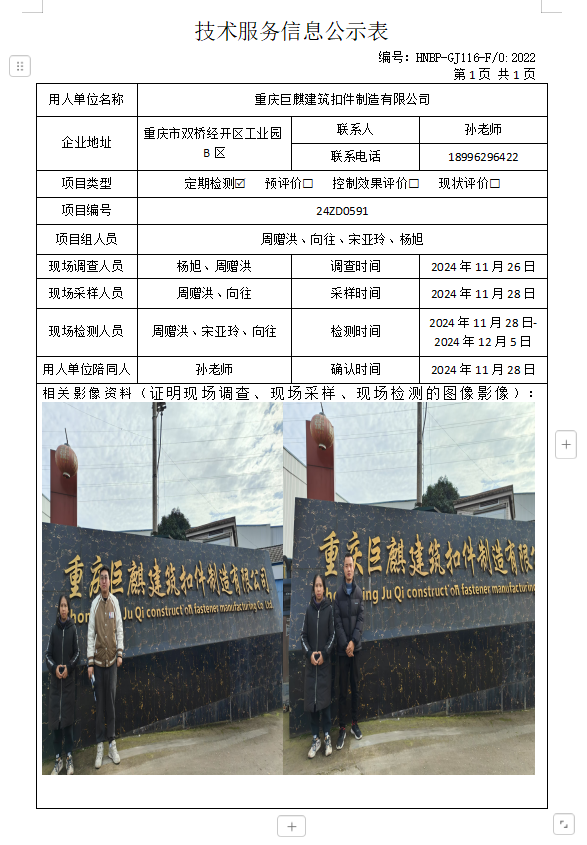 重慶巨麒建筑扣件制造有限公司定期檢測項目公示