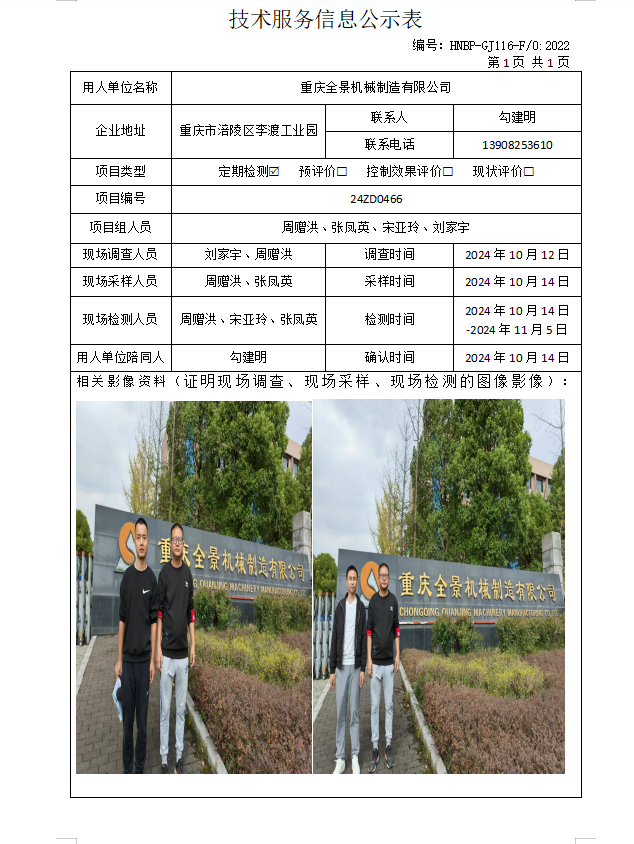 重慶全景機械制造有限公司定期檢測項目公示