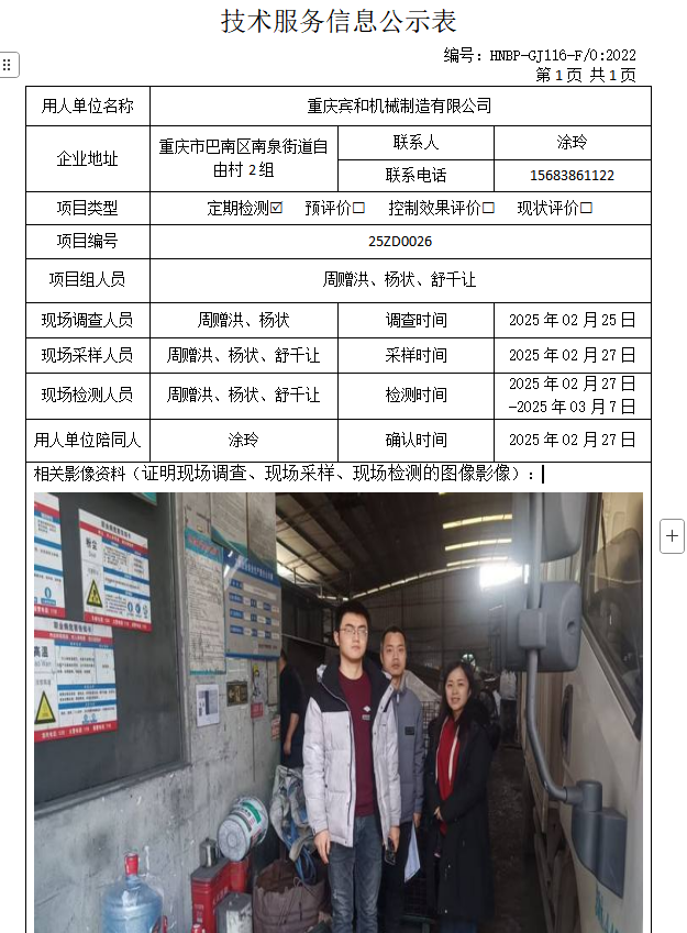 重慶賓和機(jī)械制造有限公司定期檢測(cè)項(xiàng)目公示