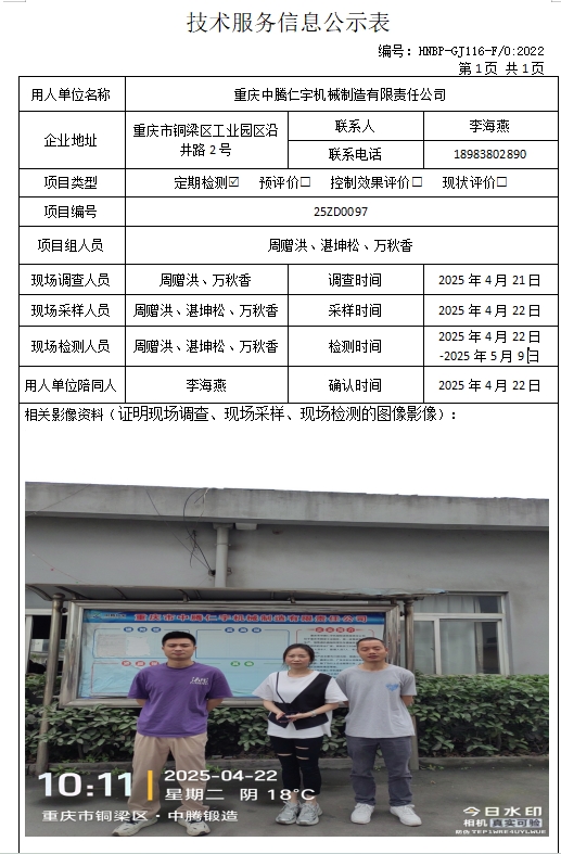 重慶中騰仁宇機械制造有限責(zé)任公司定期檢測項目公示