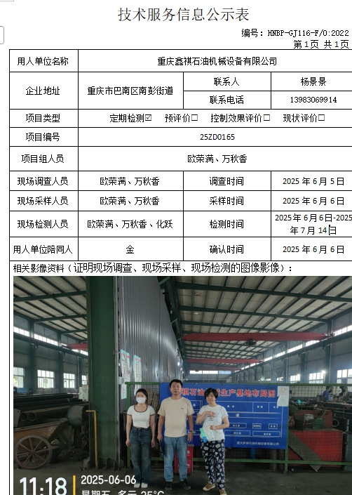 重慶鑫祺石油機(jī)械設(shè)備有限公司定期檢測項目公示