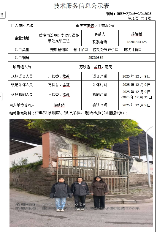 重慶市宇潔化工有限公司定期檢測項目公示